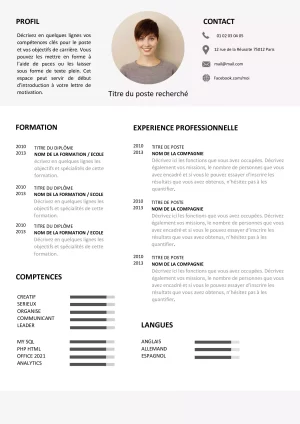 Un modèle de CV traditionnel, simple et bien organisé. Il est agréable à lire grâce à sa grande clarté. Avec un aspect monochromatique, il met l’accent sur ce qui est vraiment important : vous et vos habilités pour le poste. Il s’agit d’un modèle de CV que vous pouvez utiliser avec succès dans la plupart des entreprises. Un CV très simple qui peut servir de canevas pour tout type de candidature.