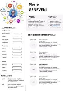 Ce type de CV conviendra aux profils séniors et aux cadres. Son contenu est présenté sur deux colonnes: à gauche, vous pourrez présenter votre profil et vos ambitions ainsi que vos qualités pro et personnelles. À droite, une large place est laissée aux détails de votre expérience professionnelle et votre parcours scolaire. En bas de page, vous pourrez présenter vos hobbies et votre maîtrise des langues.