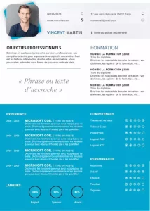 Ce modèle est très original. Il utilise des dégradés de vert et du gris. Il est graphique, et aérien. La frise des dates dans la colonne de gauche, vous permet de montrer la continuité de votre parcours et de vos expériences. L’œil est attiré par une présentation originale de vos compétences sur la partie droite du document. Par ailleurs, vos qualités, réparties sur un graphique en secteurs, permettent une présentation non conventionnelle de votre personnalité. Attention, ce CV ne vous ait conseillé que si vous maîtrisez bien le pack office, il permet d’accentuer le côté dynamique de votre profil. Nous le conseillons si vous souhaitez attirer l’œil et que vous postulez dans le secteur des technologies ou de l’informatique.